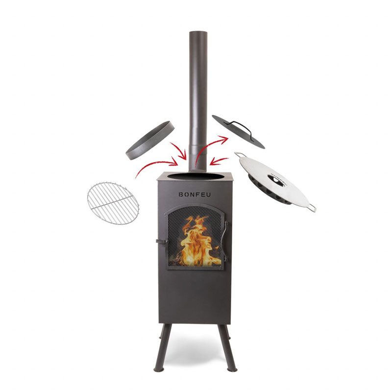 La Chimenea BonFeu BonCarré es de tamaño mediano perfecta para cualquier patio o jardín. La BonCarré se diferencia de la mayoría de nuestras chimeneas de jardín, por sus cuatro patas y su cuerpo cuadrado. Tiene salvachispas desmontable para evitar que los leños se caigan y las chispas vuelen. Y como ocurre con la mayoría de las chimeneas BonFeu, es posible cocinar con BonCarré.